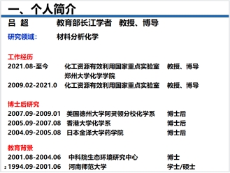 吕超, 教育部“长江学者奖励计划”特聘教授、北京化工大学/郑州大学博士生导师,英国皇家化学会会士,Analytical Methods(RSC)副主编,并任Trends in Analytical Chemistry、分析试验室等分析化学期刊编委。主要从事材料结构光谱谱表征新方法、纳米材料化学发光分析方法及复合材料早期老化荧光检测及其寿命预测的研究。主持国家自然科学基金重大基金、面上基金及国家973计划子课题等项目近10项,以通讯作者在 Angew. Chem.Int.Ed、Nat. Commun、Sci.Adv、ACS Cent. Sci、Chem.Sci、Anal.Chem等期刊发表论文100余篇,申请中国发明专利15项,专利技术转化2项。