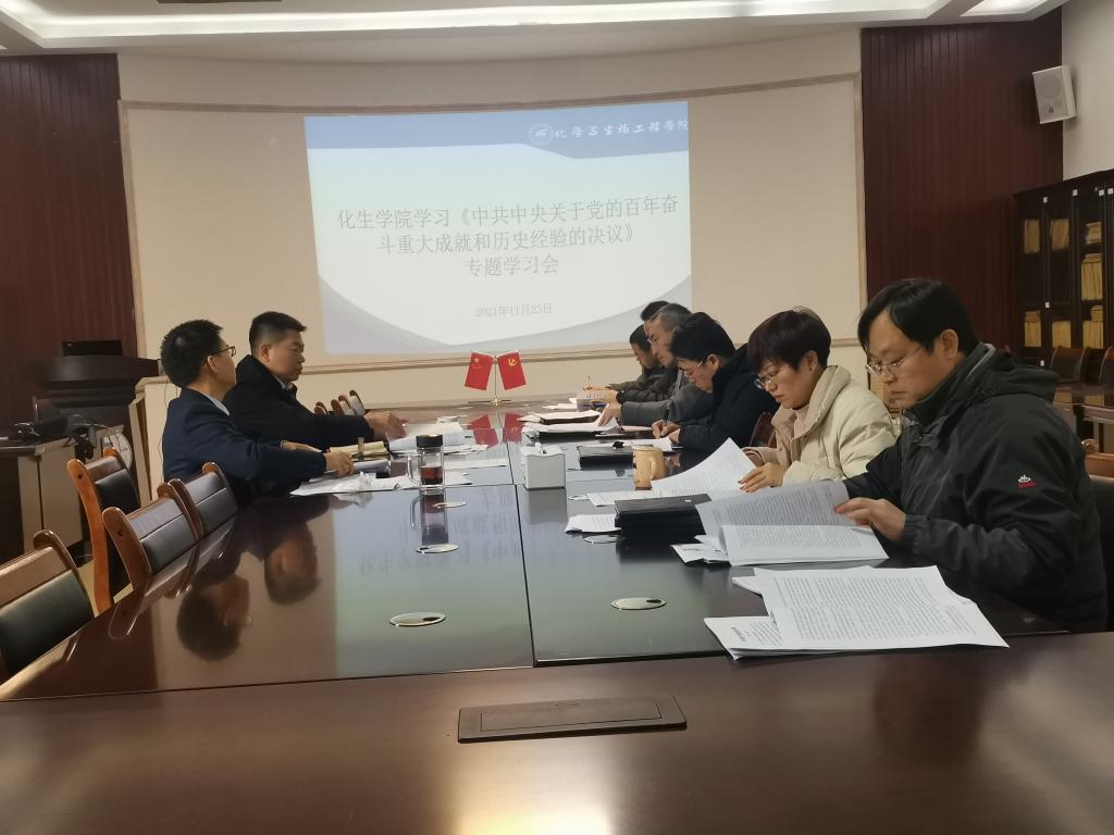 在雁山校区12217多功能室集中学习《《中共中央关于党的百年奋斗重大成就和历史经验的决议》(以下简称《决议》)。学院党政领导班子、师生党员代表参加本次学习会。本次学习会由学院党委书记彭代江同志主讲。