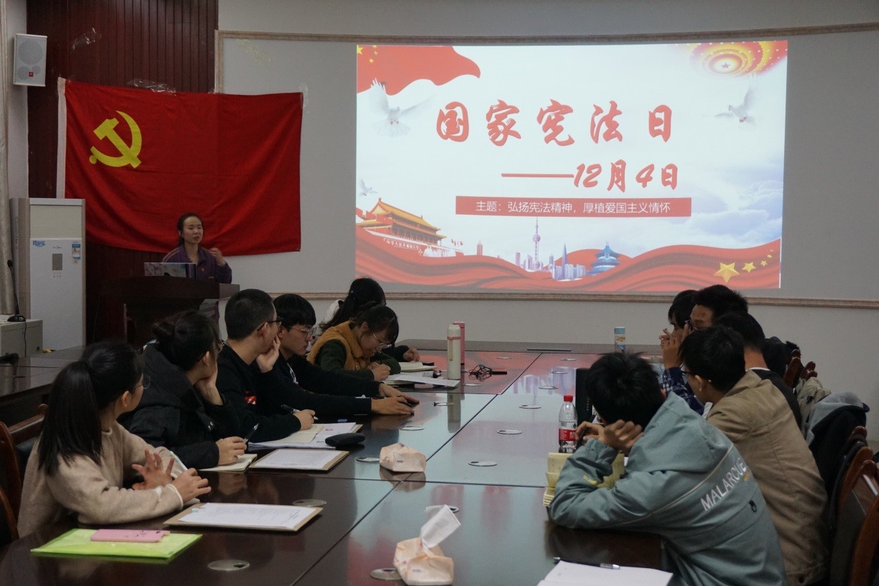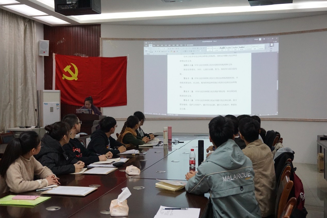 本科生第一党支部在12217会议室展开了以“弘扬宪法精神,厚植爱国主义”为主题的宪法学习会。本科生第一党支部全体党员及预备党员参加此次学习会,此次会议由支部负责人陈楠主持。
