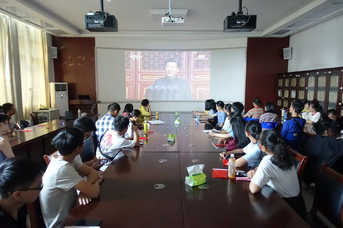 习近平总书记在大会上讲话时强调,中国的昨天已经写在人类的史册上,中国的今天正在亿万人民手中创造,中国的明天必将更加美好。全党全军全国各族人民要更加紧密地团结起来,不忘初心,牢记使命,继续把我们的人民共和国巩固好、发展好,继续为实现“两个一百年”奋斗目标、实现中华民族伟大复兴的中国梦而努力奋斗!习近平总书记一句句掷地有声的话语,让与会师生们心潮澎湃,激情昂扬。