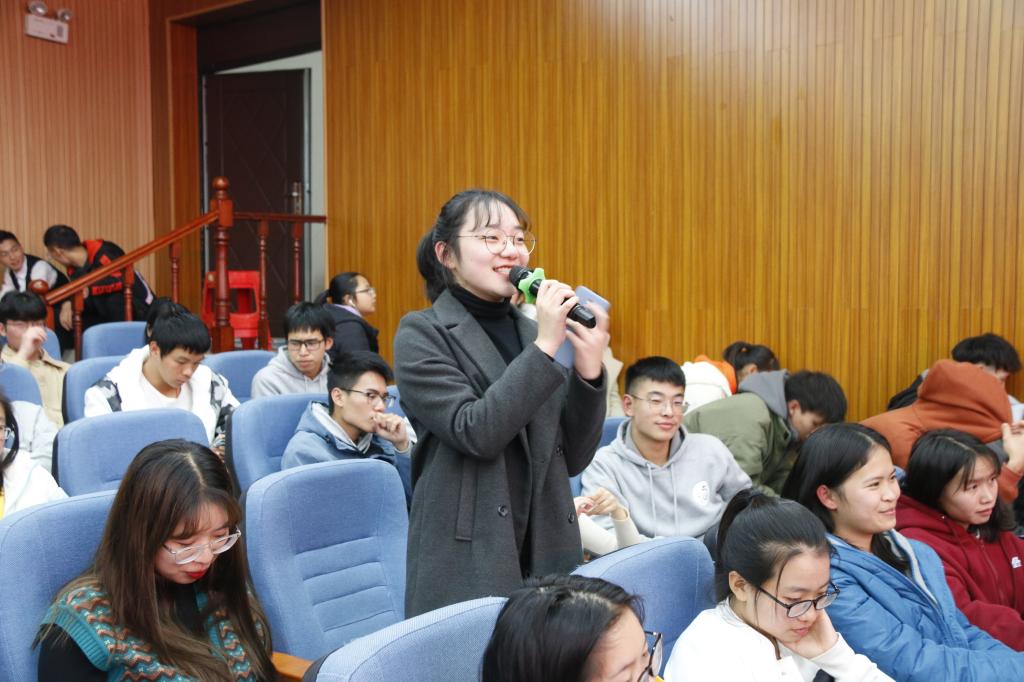 化工2018-卓越班的程夏,她向我们讲述了四级试题分值的分配,在考场上如何正确利用时间,掌握答题技巧,从而赢得高分。此外还分享了她的英文歌单以及英文电影,通过有趣的方式学习英语。在现场观众提问环节中,同学们积极踊跃地举手发言,两位学姐也耐心地解答。