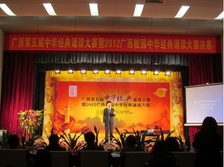 日前,由自治区语委、教育厅、广电局主办,自治区语委办、广西人民广播电台、共青团广西高校工委联合承办,广西教育出版社协办的第五届中华经典诵读大赛决赛暨2012广西校园中华经典诵读大赛总决赛在南宁举行。韩漫h