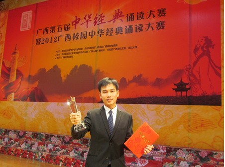 梁丰同学朗诵的篇目《礼记·大学》,以音色绚丽,音韵浑厚,表达自然,深刻诠释了《大学》中“以修身为本”的中心思想,获得了一致好评,展现了我校大学生良好的中国传统文化素养。广西第五届中华经典诵读大赛暨2012广西校园中华经典诵读大赛自今年4月份启动以来,全区各小学、中学、大学的师生及社会各界人士约30万人参与到活动中。经过学校初赛、赛区复赛共有110名选手进入总决赛,在中学生组、大学生组(专业组和非专业组)、中小学教师组、大学教师组(专业组和非专业组)、集体组、综合组等8个组别中激烈角逐。