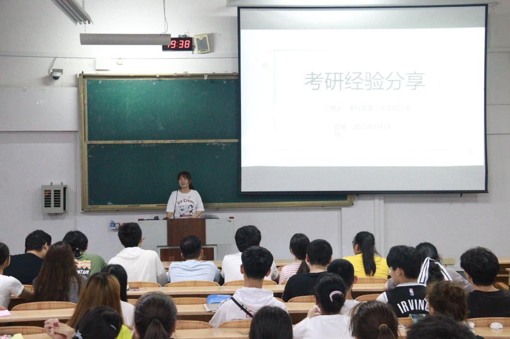 于06207教室开展受助学生代表考研经验交流会。主讲人为2021年成功考取研究生的费佳伟和许诺,2018级160位学生参加此次经验分享会。
