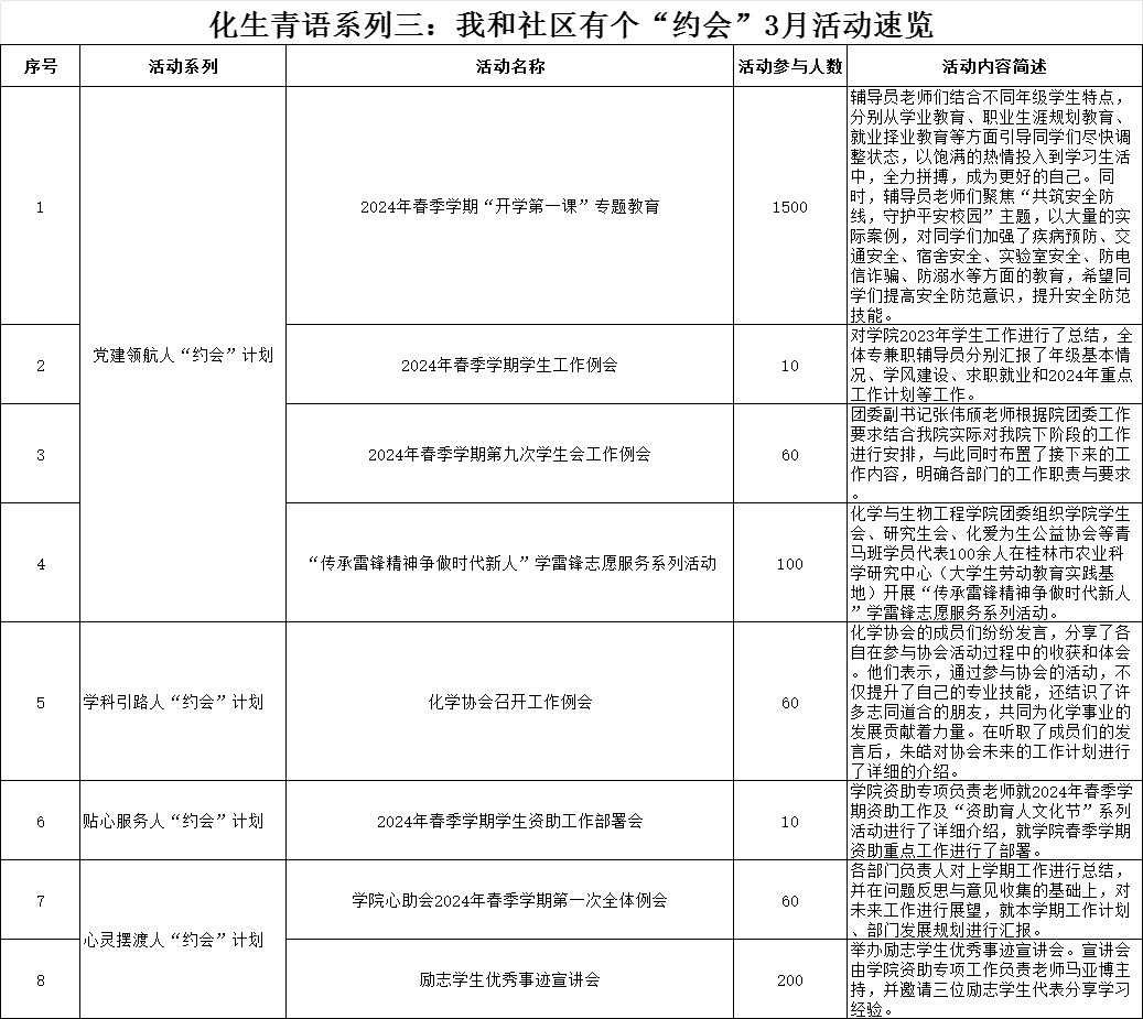 将“一站式”学生社区以“党建+X”模式为基础,结合学院【化生青语】育人文化,将学院育人体系下沉社区,打造【化生青语】系列三——我和社区有个“约会”特色活动。3月份,结合学院社区团队,按照学院社区我和社区有个“约会”特色品牌活动,党建领航人“约会”计划、学科引路人“约会”计划、贴心服务人“约会”计划、心灵摆渡人“约会”计划四个系列活动同步推进,共同助力学院学子学习、生活等方面的发展。按照“约会计划”,学院举办活动如下。