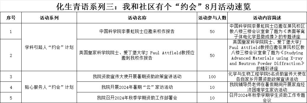 将“一站式”学生社区以“党建+X”模式为基础,结合学院【化生青语】育人文化,将学院育人体系下沉社区,打造【化生青语】系列三——我和社区有个“约会”特色活动。8月份,结合学院社区团队,按照学院社区我和社区有个“约会”特色品牌活动,学科引路人“约会”计划、贴心服务人“约会”计划同步推进,共同助力学院学子学习、生活方面的发展。按照“约会计划”,学院举办活动如下。