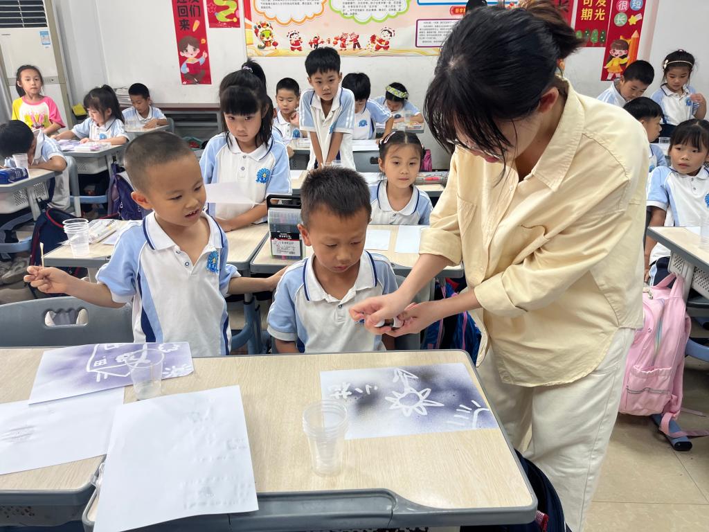 活动当日,经过培训的受助学生志愿者们满怀期待地踏入小学校园,迅速在教室布置起 “魔法舞台”,为小朋友们发放趣味实验所需的物资。他们首先以专业为背景,让小朋友们了解显微镜下的微生物,培养皿中也能“绘画”,然后精心设计了“化学密信(维生素C显色实验)”、“变色魔法师(紫甘蓝酸碱指示剂)”趣味实验,将化学知识化作神奇 “魔法”,带领小学生们开启探索科学的奇妙之旅。除了趣味实验,创意绘画环节同样精彩纷呈。志愿者们以化学实验用具为灵感,指导孩子们用画笔描绘心中的 “化学世界”,课堂氛围热烈而活跃。