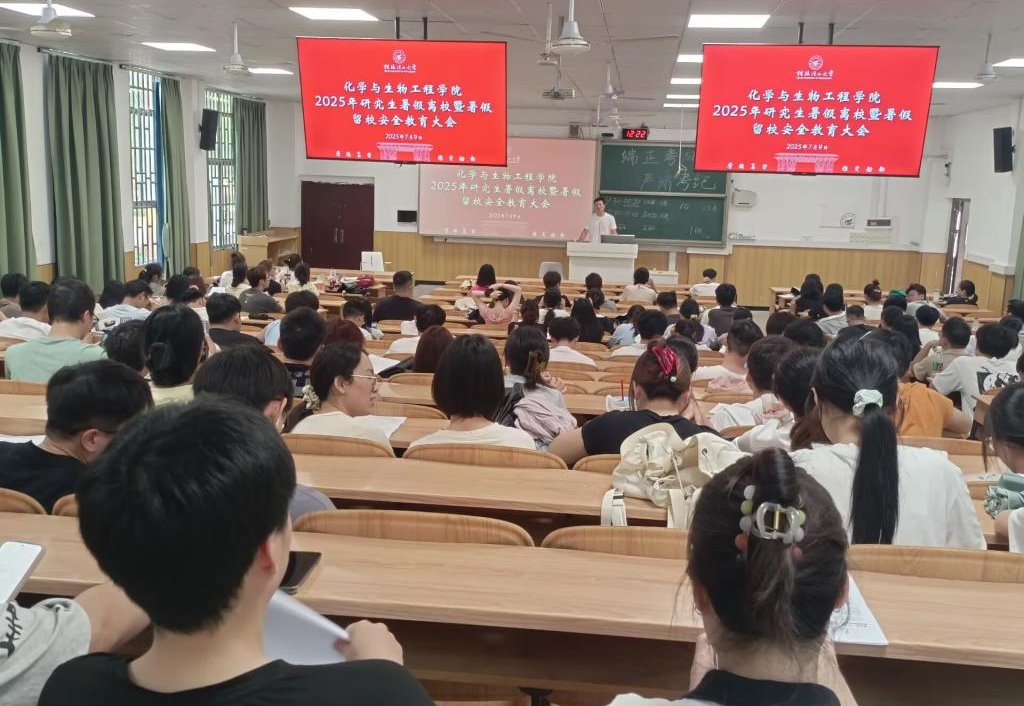 为做学院2025年暑期研究生离校、留校安全教育工作。7月8日中午,学院在雁山校区06104、06105教室同时召开2025年研究生暑假离校暨暑假留校安全教育大会。学院副院长孔翔飞、研究生辅导员黄道坤、马亚博与全体研究生参加了会议。