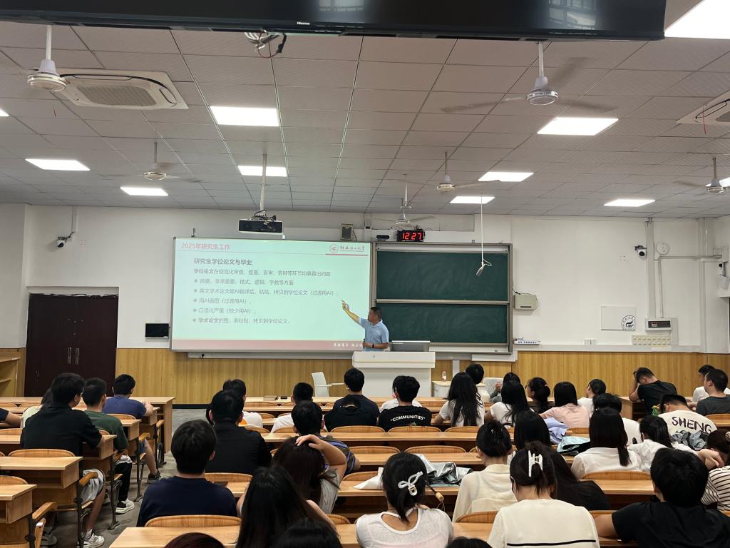 研究生学位授予工作实施细则》,向同学们特别强调了毕业申请条件及学位申请条件细则,提醒毕业生们务必多与导师沟通交流,认真完成毕业论文,为顺利毕业做好准备。