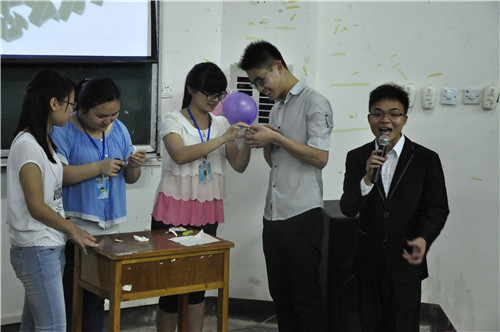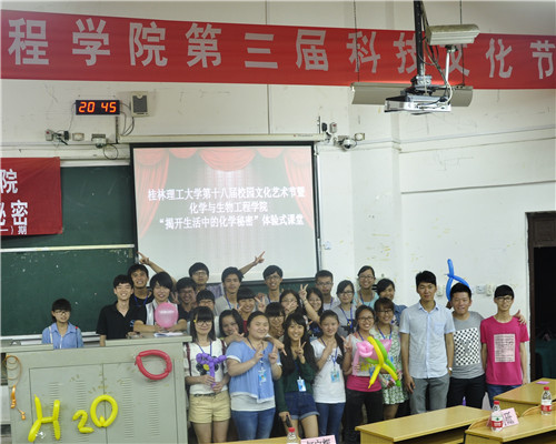 第十八届校园文化艺术节之“揭开生活中的化学秘密”体验式课堂活动。学院何宗辉老师、学院研究生会副会长张海峰以及各兄弟学院团委学生会代表作为嘉宾与学院同学一同参加了此次活动。