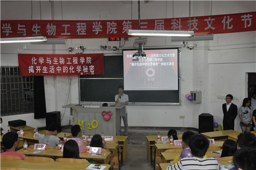 何宗辉老师首先致开幕词,他说到在理工科院校开展大学生科技活动具有很大的意义,对于提升同学们的专业知识素养起到很好的促进作用,他希望同学们能够以此类活动为契机,体验化学的奥秘,寓学于乐,培养自己对化学学科的钻研精神。接着主办方为大家播放了《进击的化学》宣传片,神秘新奇的化学实验现象,博得在场同学的阵阵惊呼。接下来张海峰同学结合PPT带领大家从生活食品类、生活衣物类等方面走进化学,揭开生活中的化学秘密,使大家对生活中的化学有了一个全新的认识。在课堂讲解后进行了实验展示环节,实验操作人员先后为大家展示了电池生火、可乐喷泉等现场实验,最后是观众互动环节,同学们积极踊跃参与答题,把现场气氛推向了最高点。