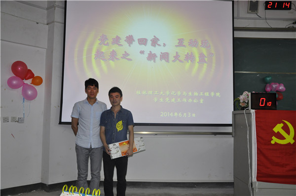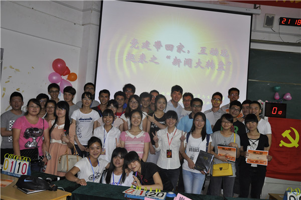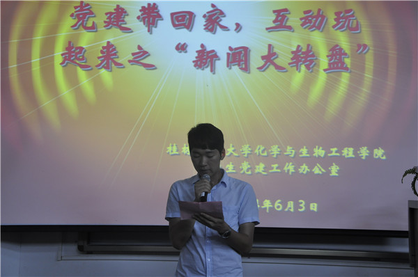 学生党建办公室主办的党建带回家,互动玩起来之“新闻大转盘”活动在雁山校区05101室举行。学生党建办公室主任何宗辉老师、韩漫h