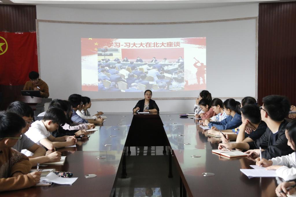 在12217会议室召开了学习习近平总书记北大师生座谈会重要讲话精神的会议。本次会议由学院团委书记饶筠筠老师主持,学院青年教师代表、学院团委主要学生干部以及各团支部书记参加本次学习。