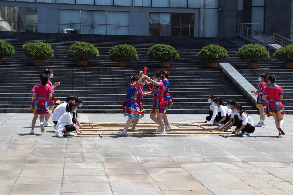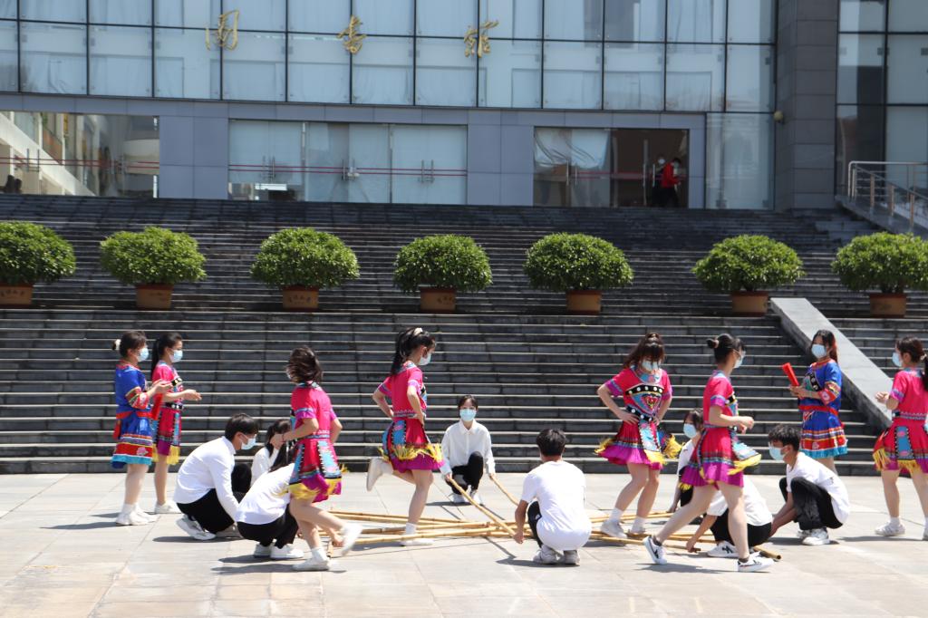 活动伊始,观看了校艺术团带来的舞蹈“站在草原望北京”,随后由学院壮乡社表演了竹竿舞“广西尼地呀”。竹竿舞又称跳竹竿,是一个以团队合作为方式的舞蹈,具有浓厚的民族文化特色,是广西壮族民间舞蹈形式之一。此次活动引来无数师生的观看,随后,围观的同学纷纷加入了跳竹竿舞的行列里。初练竹竿舞的同学,有的因为跳错了步伐就被夹掉了鞋子,有的因乱踩竹竿而仰面朝天。在经过一系列的练习过后,学生们个个精神饱满,动作标准到位,持竿者在音乐的节奏中蹲、站等姿势变化多样,在有节奏、有规律的碰击声里,跳舞者在竹竿分合的瞬间,在欢快的乐曲中,敏捷地进退,潇洒地跨竿,演绎出美丽的舞蹈。