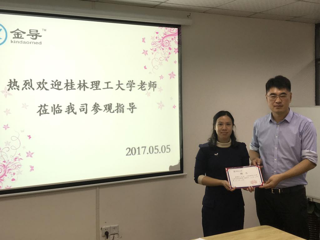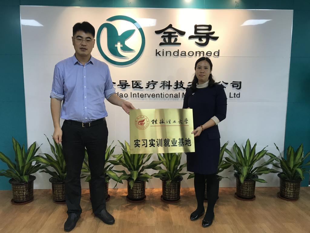 在广东珠海金导医疗科技有限公司,该公司时勇总经理热情接待了陶副书记一行。在座谈会上,公司陈世斌副总经理从公司的业务和定位、产品特点及应用、发展目标和规划、运营模式和合作愿景等方面做了详细介绍。双方就大学生创新创业、实习实训、科研成果转化等方面进行了合作洽谈,并签订了校企合作意向书。随后,陶剑飞副书记还为该公司时勇总经理颁发了韩漫h