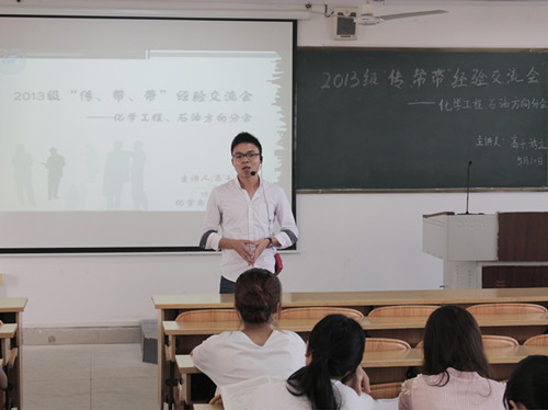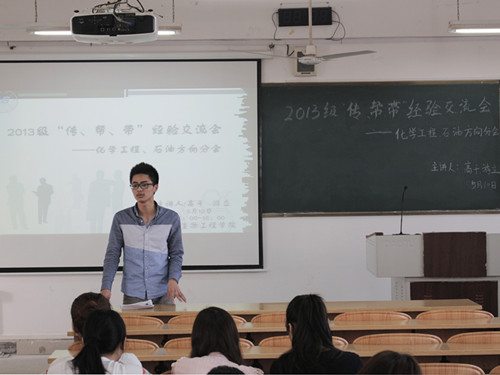 经验交流会伊始,游立学长从社会的层面分析了当代社会的人才需求。在经济与科技快速发展的年代,号召大家勇攀高峰、不断挑战自己、追求卓越,争取成为合格的高质量人才。在考研的路上,游立学长指出我们应该培养独立思考、自主学习的能力,并建议同学们不要只局限于与考研相关的书籍,应当多看多读不同类型的书,拓展视野,还给同学们推荐一些优秀的教材辅助资料。紧接着,高干学长给同学们讲诉了自己参加全国化工设计大赛的经历和感想,鼓励2013级的同学们积极备战全国化工设计大赛,通过大赛提升自己的综合能力。同时高干学长也鼓励同学们积极考研,在备考期间,建议同学们多与其他优秀同学交流经验,摆正心态,持认真踏实的态度,刻苦研究考研题型。时光荏苒,四年时间染指而过,纸上得来终觉浅,绝知此事要躬行,高干学长希望同学们做好职业规划,早准备、多实践。