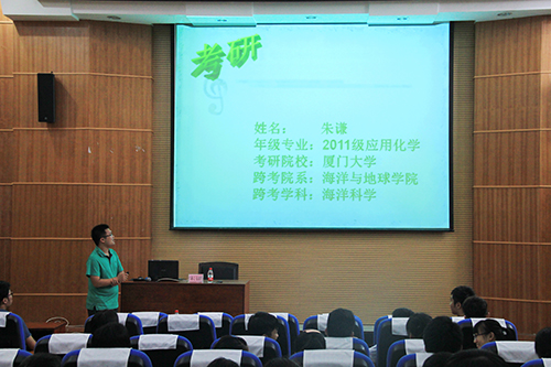 2015年成功考取研究生的学生代表张芮、朱谦、陈雪妮在会上做了经验交流。