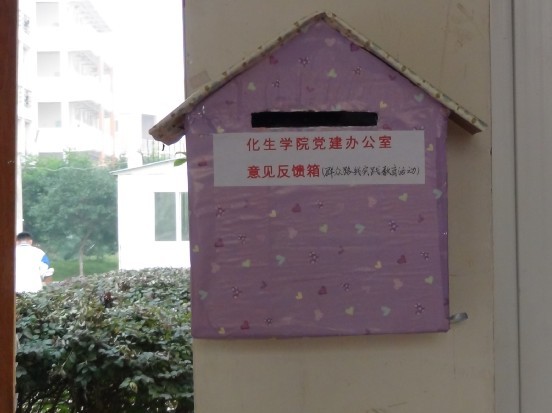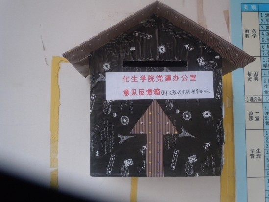 导航痕迹 当前位置: 韩漫h >> 新闻资讯 >> 韩漫h新闻 >> 正文 【群众路线教育实践】 化生学院设立党的群众路线教育实践活动征求意见箱 作者: 发布日期:2013-10-31 浏览次数: 为切实推进韩漫h 党的群众路线教育实践活动,推动韩漫h 各项工作科学发展,进一步落实密切联系同学、服务同学的工作机制:坚持服务于同学、问需于同学、问计于同学,切实做到知同学情、解同学忧、暖同学心。本着“畅所欲言,集思广益”的原则,10月22日,韩漫h 学生党建工作办公室在雁山校区12210学院学工办门口、女生宿舍4A一楼楼下公布栏、男生宿舍7#一楼楼下公布栏分别设立了意见反馈箱以及设立专用电子信箱账号:[email protected] 。面向全院广泛征求党员和群众的意见和建议。同学们可以以信件、便条及邮件的形式,从生活,学习,工作等方面,就学校管理工作和有关学校发展的各类问题提出意见和建议。意见箱收集的意见,建议和反映的问题,将由韩漫h 学生党建工作办公室安排专人管理,定期收集、整理意见信息,并分类向相应部门和有关学校领导反映,切实做到民心所向,把同学们的真实想法如如实实的反映出来。相信通过设立学生意见箱,能进一步了解同学们的心声,实现密切联系同学,服务同学,使同学得到更多实惠这一目的。同时也将拓宽同学们和学校之间的沟通渠道,充分发挥舆论监督作用,强化同学们的主人翁责任意识,调动同学们参与学校教育教学、管理服务工作的积极性,为学校发展献计献策。 女生宿舍4A一楼设立的意见反馈箱学院学生工作办公室门口设立的意见反馈箱男生宿舍7#设立的意见反馈箱 上一条:韩漫h 教师参加第十七届中国化学会有机与生物分析研讨会 下一条:喜讯:我校学子在广西高校大学生化学实验技能竞赛中喜获佳绩
