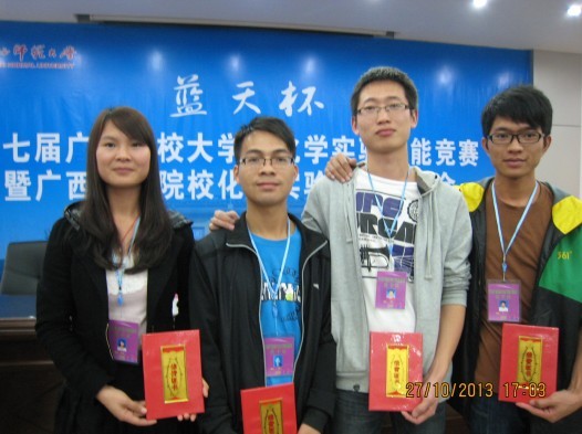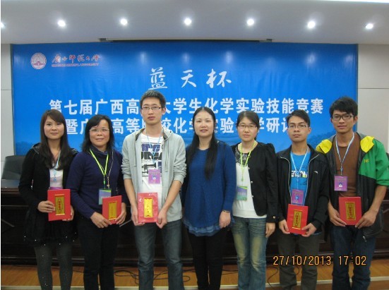 2013年10月27日,由广西教育厅主办,广西师范大学承办的“第七届广西高校大学生化学实验技能竞赛”落下帷幕。本次共有23个高校组队参加竞赛、参赛选手达92名。经过两天紧张而激烈的角逐,我校化学与生物工程学院应用化学专业四名参赛同学取得了可喜的成绩,是历届广西高校大学生化学实验技能竞赛中成绩最好的一次,其中叶楚、凌燕华同学荣获“一等奖”,陈俊同学荣获“二等奖”,黎洪增同学荣获“三等奖”。 陶慧林老师喜获“优秀指导教师奖”。