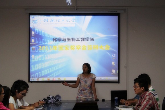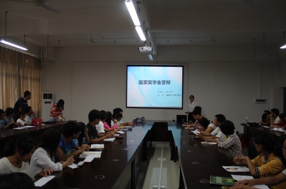 于10月8日中午在12209 教室举行2012-2013学年度国家奖学金答辩会。学院党委副书记陶剑飞与各年级辅导员担任嘉宾,各班级同学代表一起参加了答辩会并担任大众评委。
