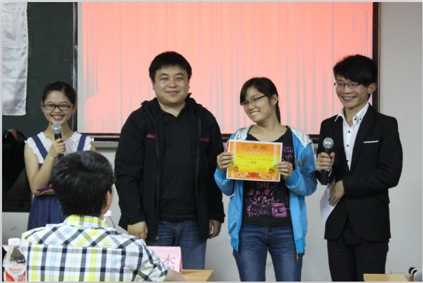 2013年学生资助政策宣传月系列活动圆满落幕。5月4日晚,化生学院“化爱为生”爱心公益协会在雁山校区06301教室举行了资助政策知识“一站到底”总决赛暨资助政策宣传活动月总结表彰大会。2011级辅导员杨建辉老师出席了大会。