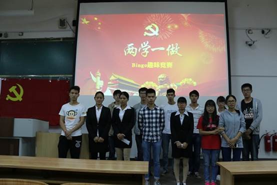 学生党员和入党积极分子对党的基本知识、习近平总书记重要讲话精神的认识,10月18日晚,由学院本科生第三党支部及学生党建工作办公室承办的“两学一做”Bingo趣味竞赛在雁山06207教室顺利举行。学院党委副书记陶剑飞、团委书记饶筠筠、16级辅导员何宗辉、学院团委副书记赵启迪、楼管委主任黄志钦应邀出席本次活动,学院七个学生党支部的所有正式党员、预备党员,大一大二积极分子参与了本次活动。