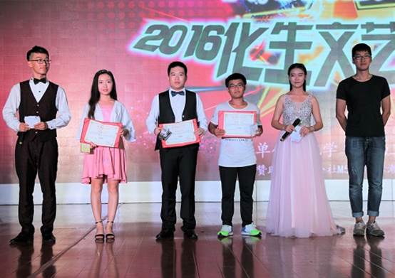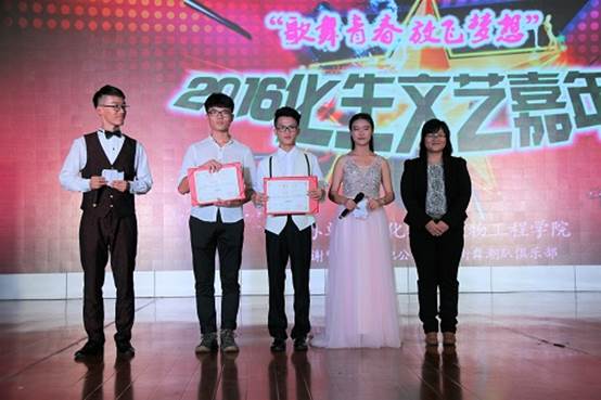 党委副书记陶剑飞老师上台为两位同学颁发获奖证书并由“吉他公社·M5+1街舞潮趴俱乐部”负责人为之送上独家提供的千元吉他。荣获二等奖的为《just be a bboy》街舞表演和由徐金海等同学表演的《时间都去哪了》,团委书记饶筠筠老师为两个获奖节目颁奖,廖坚良同学演唱的《千千阙歌》、易班研发部表演的舞台剧《白雪公主与七个小矮人》和张宇曦同学表演的《扇子舞》获得本次嘉年华的三等奖。此次歌舞青春•2016年化生文艺嘉年华到此圆满结束!
