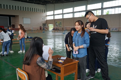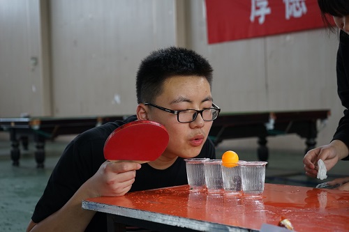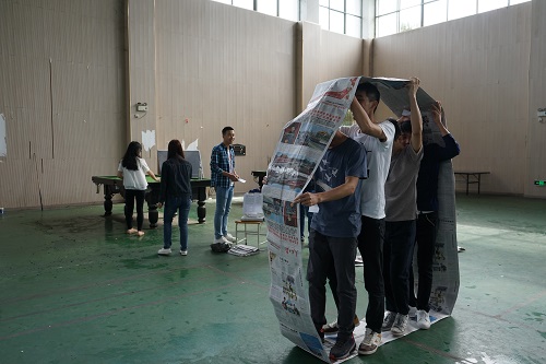 在活动过程中,“突破乌江”是由一个同学拿着乒乓球拍把乒乓球运到对面桌子上盛满水的水杯里,接着将乒乓球依次吹过杯子,考验了同学们的平衡能力;紧接着进行“遵义会议”现场历史知识问答,同学们胸有成竹,积极回答问题;“四渡赤水”的猜数字游戏,把同学们逗得哈哈大笑;“巧渡金沙江”的穿针引线,考验了同学们的动手能力;“强渡大渡河”是让同学们在一个大圆环里,协力推动着大圆环滚动;“飞夺泸定桥”的红歌抢唱游戏点燃了现场同学们的激情;随后“爬雪山”蒙眼过障碍物的游戏,考验了领头人的领导能力和队员之间的默契配合。最后一个“过草地”,分组进行,各小组的成员们双脚绑在一起,看哪个小组最先到达终点,考验了大家的团结协助能力。游戏的最后“会师吴起镇”,胜利的小组,怀着激动的心情领到了自己心仪的奖品。