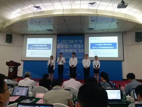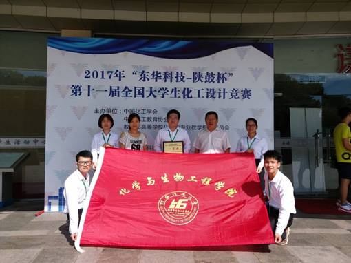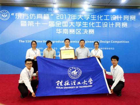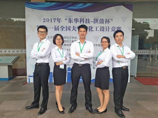 2014级卓越班本科生廖坚良、陈志和、邓家炬、林小芳、陈燕萍组成的代表队在李和平、黎燕、吕奕菊、王晓娟、刘峥、杨文等老师指导下设计的作品“NHD脱硫-甲醇合成法年产4.5万吨甲硫醇项目设计”经过师生共同努力,以其出色的设计作品和精彩的现场答辩脱颖而出,勇夺赛区特等奖;并以广西高校唯一的一支队伍进入全国总结赛,荣获全国总决赛一等奖。