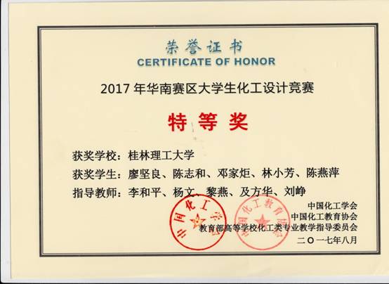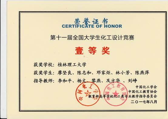 一共组成了17支队伍参赛,由李和平、吕奕菊、王晓娟、黎燕、王桂霞、姚金环、杨文、冯艳艳、刘峥、及方华等老师组成的团队进行指导。2014级卓越班本科生廖坚良、陈志和、邓家炬、林小芳、陈燕萍组成的代表队设计的作品“NHD脱硫-甲醇合成法年产4.5万吨甲硫醇项目设计”经过师生共同努力,以其出色的设计作品和精彩的现场答辩脱颖而出,勇夺赛区特等奖;并以广西高校唯一的一支队伍进入全国总结赛,荣获全国总决赛一等奖。同时,我校还获得全国贰等奖1项、叁等奖5项、华南赛区叁等奖7项,在获奖比例与数量上均为历届参赛最好成绩。获奖情况如下: