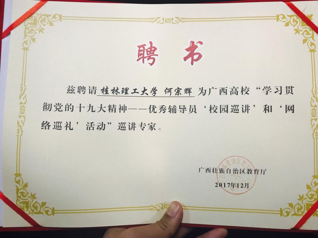 团委书记饶筠筠、辅导员何宗辉入选宣讲团名单,并受聘为广西高校“学习贯彻党的十九大精神——优秀辅导员‘校园巡讲’和‘网络巡礼’活动”巡讲专家。”