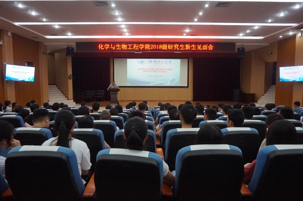 在雁山校区图书馆报告厅召开2018级硕士研究生新生见面会。学院领导班子成员、全体硕士生导师及2018级全体研究生新生参加了会议。会议由学院副院长张淑华教授主持。