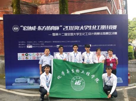 一共组成化学工程与工艺专业33支队伍参加竞赛,由李和平、王桂霞、王晓娟、吕奕菊、黎燕、姚金环、杨文、冯艳艳、刘峥、及方华等老师组成的团队分别进行指导。经过师生的共同努力,2015级化工15-3班学生何永加、邓春旭、蒋世权、黄德志、蒙才桂组成的“宁静致远”团队进入华南赛区决赛,该团队提交设计的作品“年产10000吨异丁烯一步法生产AMPS项目设计”以其出色的设计作品和精彩的现场答辩脱颖而出,获得华南赛区壹等奖,并荣获全国总决赛贰等奖。同时,韩漫h