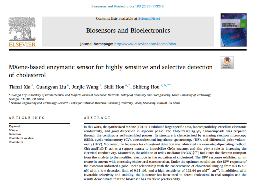 侯士立高级工程师课题组在MXene纳米材料研究领域取得新进展,相关研究成果以MXene-based enzymatic sensor for highly sensitive and selective detection of cholesterol为题在国际知名期刊Biosensors and Bioelectronics(IF=10.257)上发表。该项研究得到广西科技基地和人才专项、韩漫h
