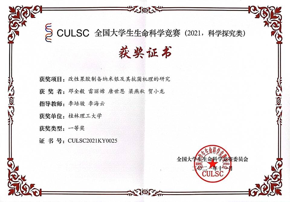 学子以严谨认真的态度和坚持不懈的努力对待此次比赛,严格按照比赛要求按期按质按量将实验记录、实验结果等上传到竞赛平台。最终,生物工程2018-2班邓全毅等同学在李培骏和李海云老师的指导下完成的项目《改性果胶制备纳米银及其抗菌机理的研究》获得全国一等奖。