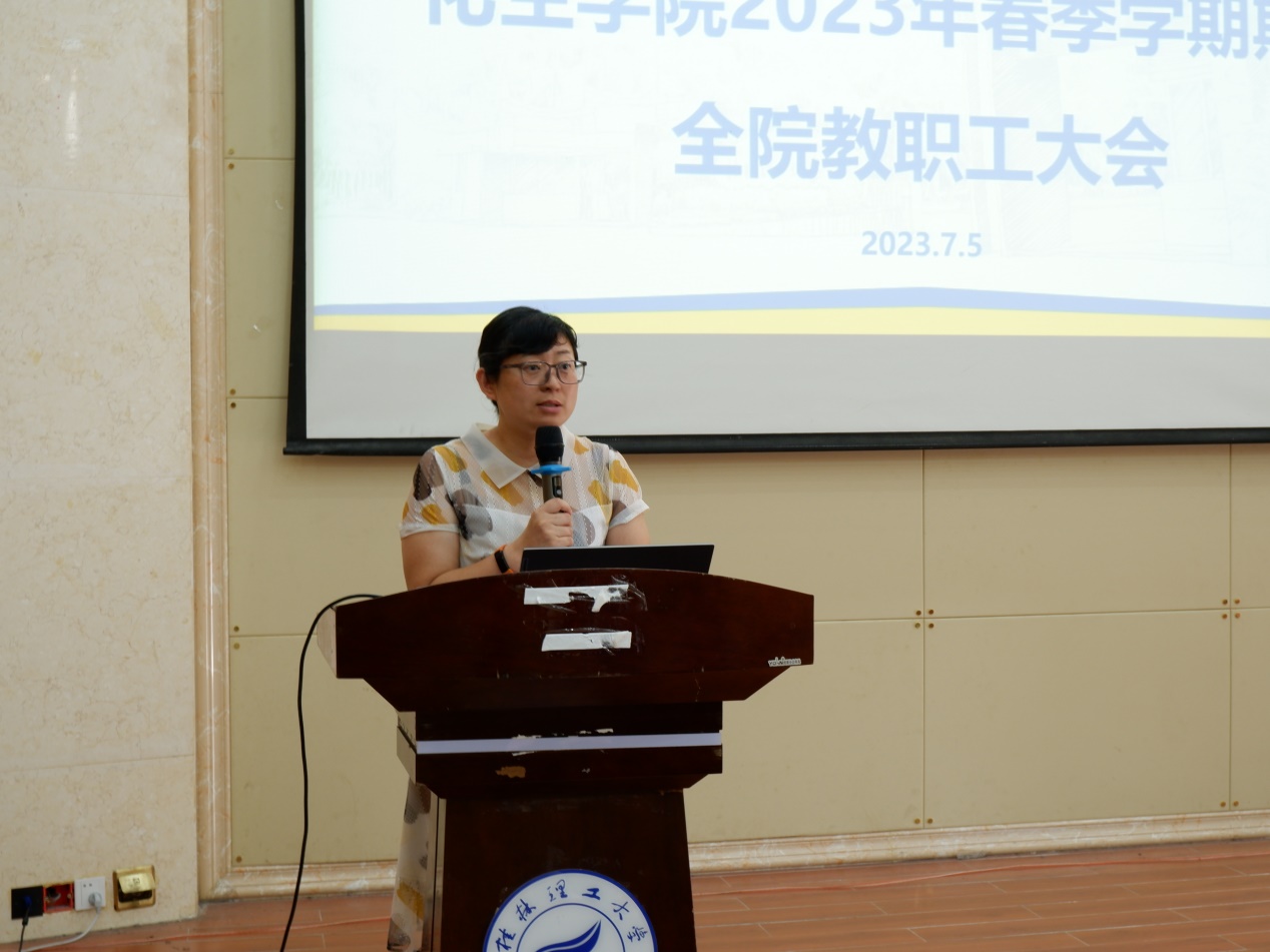 在雁山校区萃华楼报告厅召开2023年春季学期期末全院教职工大会,学院全体教职工参加。会议由学院院长匡小军主持。