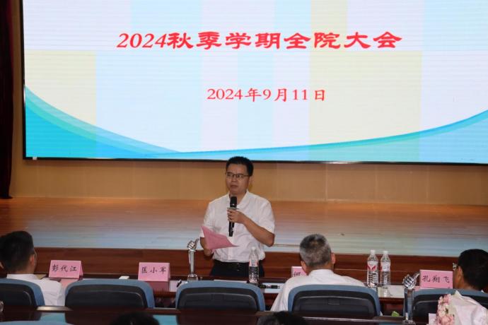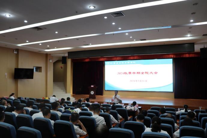 在雁山校区图书馆报告厅召开2024年秋季学期全院教职工大会,学院全体教职工参加。会议由学院院长匡小军主持。