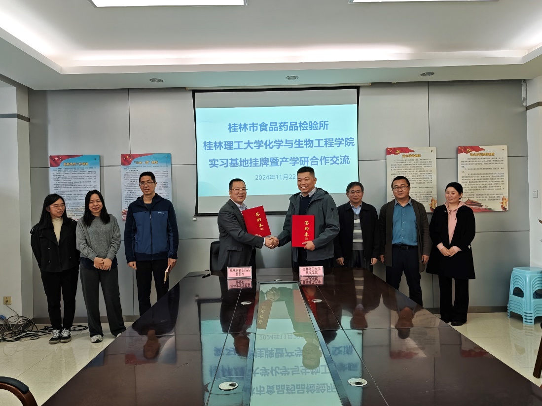 的发展近况、专业特色、基层党组织建设和发展规划等,着重介绍了学校设立教学实践基地的目的和学院在这方面工作的成效。陆桂峰所长详细介绍了桂林市食品药品检验所组织架构、组织建设及部门职责,尤其深切希望所里年轻干部加强与学校之间的合作与交流。座谈会上,双方就教学实习基地建设、科研项目合作、兼职导师及兼职授课教师等相关内容进行了深入交流并达成了广泛共识。座谈会后,双方签订了教学实习基地协议,并举行了挂牌仪式。