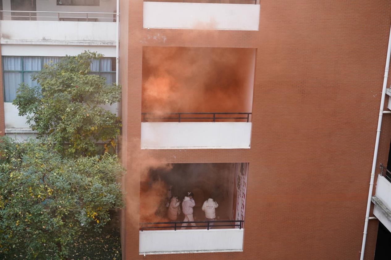随后,在教十二楼释放消防模拟警报,各楼层师生迅速进入演练状态,在学校保卫处和各负责老师的带领下,全体人员用湿毛巾捂住口鼻,弯腰贴墙有序穿过浓烟,有序组织学生从通过楼道安全撤离“火场”,有条不紊地到达安全区域,同学们通过现场演练,掌握了应急逃生基本技能技巧。