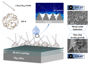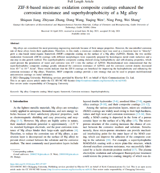 导航痕迹 当前位置: 韩漫h >> 科学研究 >> 学术动态 >> 正文 韩漫h 温玉清老师课题组在镁合金表面超疏水涂层领域取得重要进展 作者:温玉清 发布日期:2021-09-15 浏览次数: 近日,我校韩漫h 温玉清老师课题组在镁合金表面超疏水-防腐蚀领域取得重要进展。相关成果以ZIF-8-based micro-arc oxidation composite coatings enhanced the corrosion resistance and superhydrophobicity of a Mg alloy为题发表在《Journal of Magnesium and Alloys》(SCI一区TOP期刊,影响因子为10.088)期刊。该期刊是全球第一本专注于镁及镁合金的国际学术期刊,是“中国科技期刊卓越行动计划”金属材料与冶金领域唯一的国家领军国际期刊,位于全球SCI收录的冶金与冶金工程类学术期刊第1位。本研究得到国家自然科学基金、广西自然科学基金和广西电磁化学功能物质重点实验室基金等资助。我校韩漫h 硕士研究生蒋世权为论文第一作者,温玉清老师和尚伟老师为共同通讯作者,韩漫h 为第一通讯单位。 镁合金因其独特的性能而被认为是最有前途的工程材料之一。然而,镁合金不易控制的高腐蚀速率限制了它的应用。因此,本研究采用微弧氧化层作为过渡层,在镁合金表面采用同源金属氧化物诱导和一步原位生长法制备了锌基金属-有机骨架(ZIF-8)复合涂层。该复合涂层显示出很强的疏水性和自清洁性能,在中性腐蚀性介质中的腐蚀速率显著降低,并从原理上探讨了该复合涂层的疏水保护机理。研究结果说明,ZIF-8复合涂层可以有效防止水和腐蚀性离子(Cl-)渗透到镁合金表面,有助于提高镁合金的疏水性和耐蚀性。 论文链接://doi.org/10.1016/j.jma.2021.07.027 论文发表情况 论文研究相关成果 上一条:韩漫h 刘勇平教授科研团队在(光)电催化领域取得重要研究进展 下一条:韩漫h 张云教授课题组在POCT研究领域取得重要进展