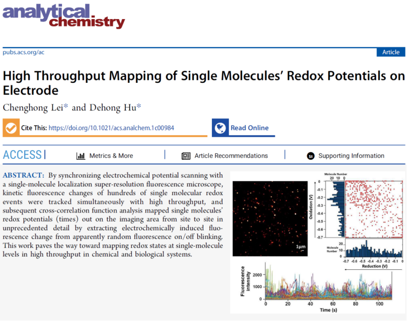 雷呈宏教授与美国太平洋西北国家实验室Dr. Dehong Hu高级研究员合作,在高通量单分子荧光光谱电化学(High Throughput Single-Molecule Fluorescence Spectroelectrochemistry)研究领域取得重要进展。相关成果以“High Throughput Mapping of Single Molecules’Redox Potentials on Electrode”为题发表在国际著名期刊美国化学会出版的Analytical Chemistry上。该刊是分析化学专业领域的顶级期刊,读者受众多,影响广泛(Top 1区)。这项工作是两位合作者继作为最早发展单通量单分子荧光光谱电化学的研究者之一十年后,又明确提出高通量单分子荧光光谱电化学的理论构想并取得实验验证的奠基性原创性论文。该项研究得到国家自然科学基金委地区基金项目、广西自然科学基金委重点项目、广西外国高端人才项目和韩漫h