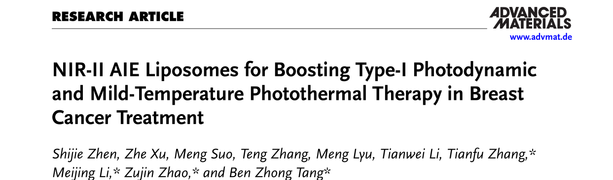 甄士杰老师/李美静博士联合广州医科大学张天富副教授、华南理工大学赵祖金教授和香港中文大学(深圳)唐本忠院士在顶级期刊Advanced Materials上发表题为《NIR-II AIE Liposomes for Boosting Type-I Photodynamic and Mild-Temperature Photothermal Therapy in Breast Cancer Treatment》(10.1002/adma.202411133)的研究论文。论文第一作者是韩漫h