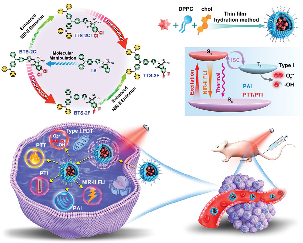 鉴于此,本研究充分利用聚集诱导发光(AIE)分子的结构优势,结合供体基团工程和氟化工程的策略,成功构建了一系列具有NIR-II荧光成像(FLI)、I型光动力(PDT)和低温光热(PTT)的近红外二区AIE光敏剂。多转子、扭曲结构以及低频振动形式赋予光敏剂近红外二区AIE特性、高效的自由基活性氧产生能力以及卓越的低温光热转换效率。体外和体内评估表明,所构筑的脂质体可以实现在肿瘤部位的富集,同时在激光辐照下可以实现近红外二区成像模态下I型光动力(PDT)和低温光热(PTT)联合治疗,从而实现对原位乳腺癌的准确诊断和高效治疗。该研究成果为设计近红外二区多模态AIE光诊疗材料提供了新思路,并加速了AIE光诊疗平台在肿瘤诊疗中的临床转化。